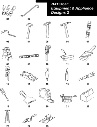 This batch of 2D DXF Art Equipment & Appliance Designs 2 contains 25 2D DXF files. Each DXF Equipment & Appliance Design file is pre-scaled in inches, not millimeters. However, any CAD Design or CAD/CAM software should be able to re-scale each 2D DXF file as needed.