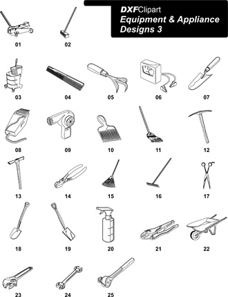This batch of 2D DXF Art Equipment & Appliance Designs 3 contains 25 2D DXF files. Each DXF Equipment & Appliance Design file is pre-scaled in inches, not millimeters. However, any CAD Design or CAD/CAM software should be able to re-scale each 2D DXF file as needed.