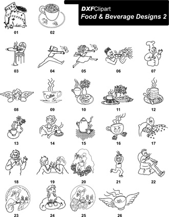This batch of 2D DXF Art Food & Beverage Designs 2 contains 26 2D DXF files. Each DXF Food & Beverage Design file is pre-scaled in inches, not millimeters. However, any CAD Design or CAD/CAM software should be able to re-scale each 2D DXF file as needed.