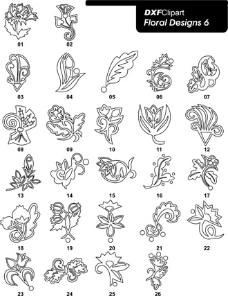 This batch of 2D DXF Art Floral Designs 6 contains 26 2D DXF files. Each DXF Floral Design file is pre-scaled in inches, not millimeters. However, any CAD Design or CAD/CAM software should be able to re-scale each 2D DXF file as needed.
