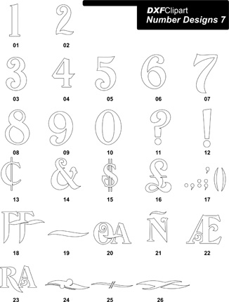 This batch of 2D DXF Art Number Designs 7 contains 26 2D DXF files. Each DXF Number Design file is pre-scaled in inches, not millimeters. However, any CAD Design or CAD/CAM software should be able to re-scale each 2D DXF file as needed.