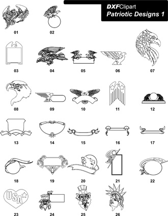 This batch of 2D DXF Art Patriotic Designs 1 contains 26 2D DXF files. Each DXF Patriotic file is pre-scaled in inches, not millimeters. However, any CAD Design or CAD/CAM software should be able to re-scale each 2D DXF file as needed.