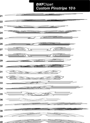 This batch of 2D DXF Art Custom Pinstripe 10b contains 20 2D DXF files. Each DXF Custom Pinstripe Design file is pre-scaled in inches, not millimeters. However, any CAD Design or CAD/CAM software should be able to re-scale each 2D DXF file as needed.