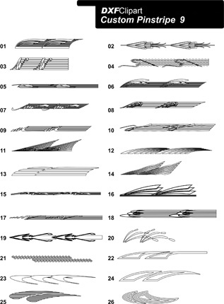 This batch of 2D DXF Art Custom Pinstripe 9 contains 26 2D DXF files. Each DXF Custom Pinstripe Design file is pre-scaled in inches, not millimeters. However, any CAD Design or CAD/CAM software should be able to re-scale each 2D DXF file as needed.