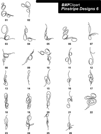 This batch of 2D DXF Art Pinstripe Designs 6 contains 26 2D DXF files. Each DXF Pinstripe Design file is pre-scaled in inches, not millimeters. However, any CAD Design or CAD/CAM software should be able to re-scale each 2D DXF file as needed.